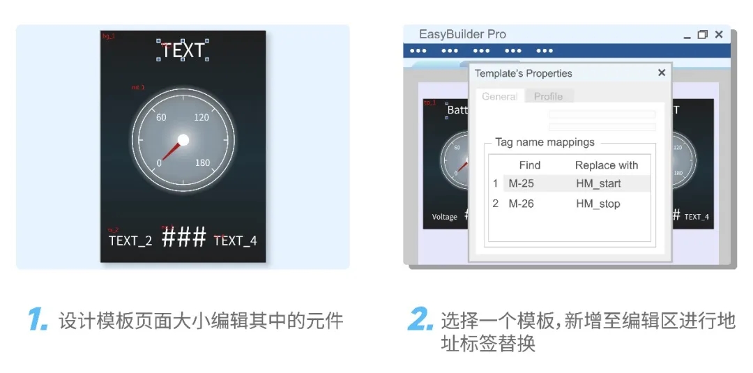 開發(fā)者可以將希望重復(fù)使用的視窗頁面定義為模板,接著便能快速將模板復(fù)制到HMI其它頁面中使用。此功能有助于開發(fā)者以更快速完成HMI程序開發(fā),省下大量的開發(fā)時(shí)間。